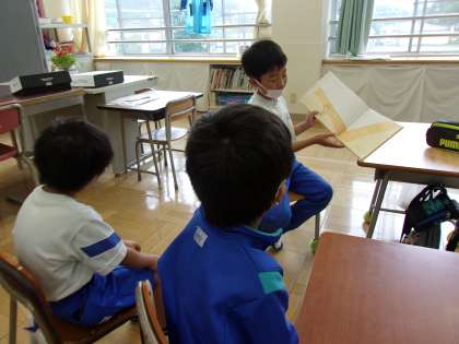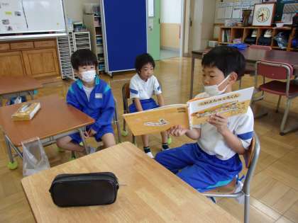ひびきの読み聞かせの様子。ひびきでは上級生が、下級生に読み聞かせをしています。