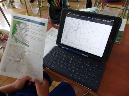 めあて「台風が近づくとてんきはどうなるか」を立て、2019年10月21日(台風19号)から調べたり、考えたりしました。