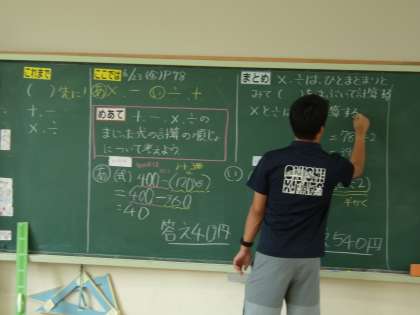 6月23日(金) 4年算数 公開日 2023/06/23 更新日 2023/06/23 できごと めあて「+、−、×、÷」のまじった式の計算の順序について考えよう」を立て、まおめでは「×、÷はひとまとまりとみて( )をはぶいて計算する。×、÷は先に計算する」とまとめることができました。