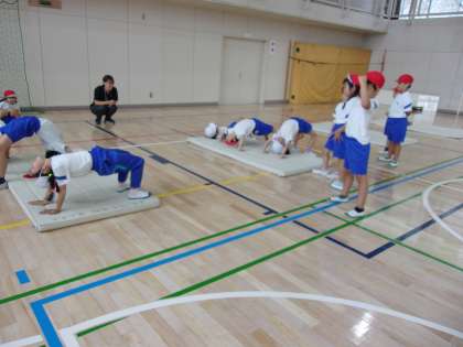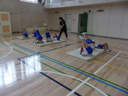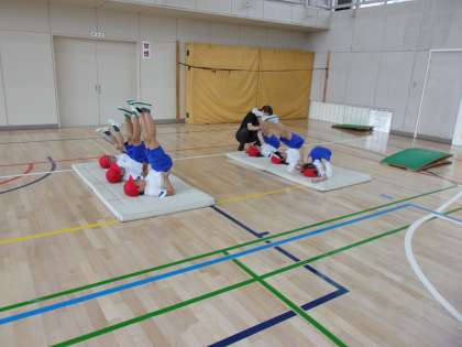 マットを使った運動遊びに取り組んでいます。今日は背支持倒立(首倒立)やブリッジなどを行いました。