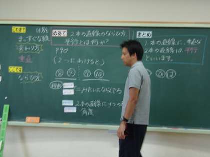 めあて「2本の直線の並び方、平行とは何か」を立て、平行とはどんなものなのかを考えました。