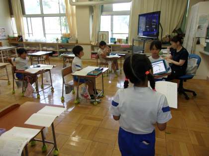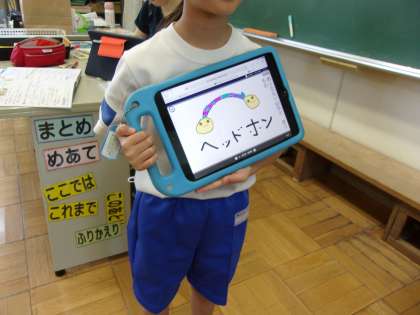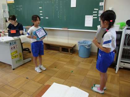 「あったらいいな こんなもの」で、めあて「ともだちにしつもんしよう。しつもんにこたえて くわしくかんがえよう」を立て、みんなの前で、発表と質問のやり取りをしました。