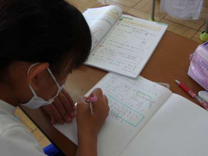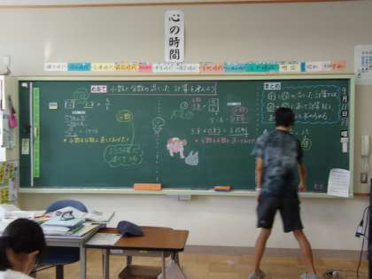めあて「小数と分数の混じった計算を考えよう」を立て、3.8×5/6の計算方法を考えました。