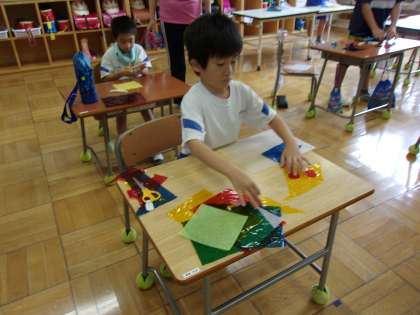 9月12日(火) 2年図工 公開日 2023/09/12 更新日 2023/09/12 できごと 「いろの見えかた むげん大」の学習で、めあて「いろいろな色をつかって、くふうして形をつくろう」を立て、カラーセロハンを三角形や四角形、丸などに切り、並べたり重ねたりして作品作りをしました。