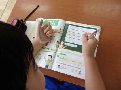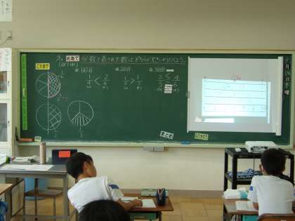 めあて「分数で表された数は、どちらが大きいか比べよう」を立て、数直線を使って比べました。
