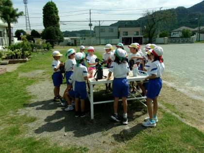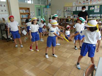 9月15日(金) 3,4年体育 公開日 2023/09/15 更新日 2023/09/15 できごと 暑さ指数(WBGT)が高いため、外では、歩いて徒競走の走るコースを確認しました。そして、水分補給を行い、教室に移動してバトン練習を行いました
