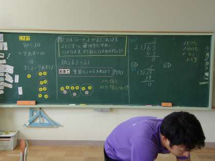めあて「筆算の仕方を考えよう」を立て、2桁÷2桁の筆算のやり方を学習しました。