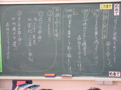 めあて「よりよい学校をめざして話し合う」を立て、1班「マイナス言葉を減らすには?」2班「20分休みのマラソン練習を最後までやるには?」3班「授業中集中して取り組むには?」のテーマで話合いを行いました。