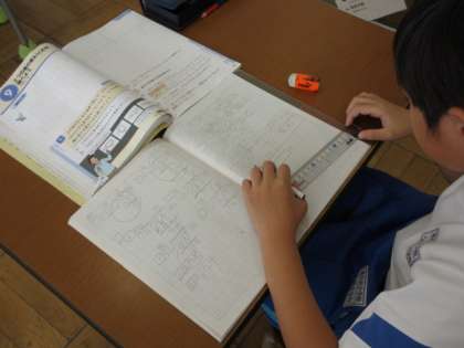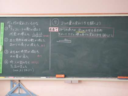 10月17日(火) 4年算数 公開日 2023/10/17 更新日 2023/10/17 できごと 「2つの量の変わり方を調べよう」で、めあて「まわりの長さが18cmになる長方形をかいて、たてと横の長さの変わり方を調べよう」を立て、図を描きながら考えました。
