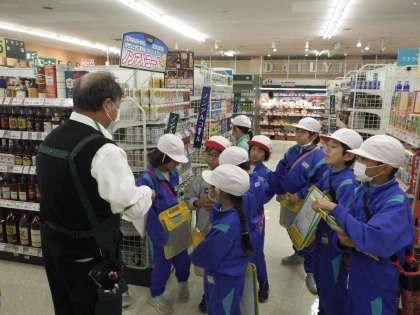 10月18日(水) 3年社会科見学 公開日 2023/10/18 更新日 2023/10/18 できごと 地元のスーパーにお世話になり、社会科見学をさせていただきました。子どもたちは事前に用意していた質問をお店の人にしたり、お店の人の説明を聞いたりしながら、お店の様子や、お店の工夫について学習しました。