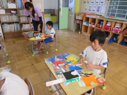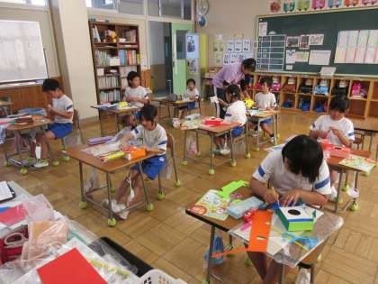 10月19日(木) 2年図工「音づくりフレンズ」 公開日 2023/10/19 更新日 2023/10/19 できごと 輪ゴムを使って音が出るように作ります。色画用紙や折り紙、色ペンを使い、飾り付けに工夫を凝らしていました。