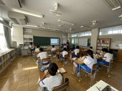 給食時に、栄養についてお話をしていただきました。食べ物の「色」は、栄養素の種類を表すそうです。複数の色が見られる食事を心がけると良いようです。