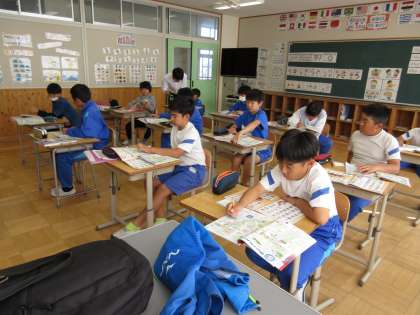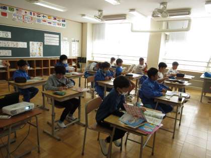 10月24日(火) 5年外国語 公開日 2023/10/24 更新日 2023/10/24 できごと めあて「オリジナルタウンで道案内をしよう」を立て、教科書の地図を使って道案内をしたり、道案内を聞いてどの場所へたどり着けたかを答えたりしました。