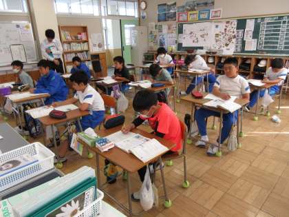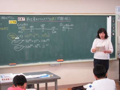 めあて「単位量あたりの大きさを使って、問題を解こう」を立て、いろいろな単位の問題に取り組みました。