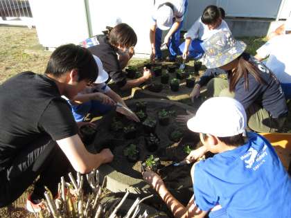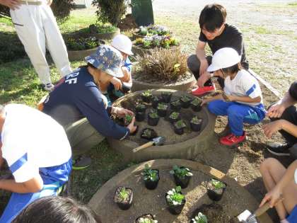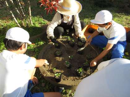 地域の方からいただいたパンジーとビオラを、委員会の時間を使って子どもたちが花壇へ植えました。