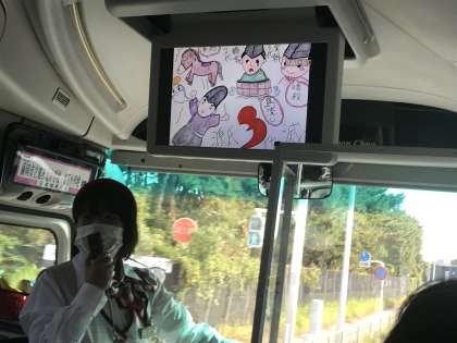 車中では、バスガイドさんから鎌倉の歴史の話に耳を傾けたり、海の景色を楽しんだりしながら過ごしています。