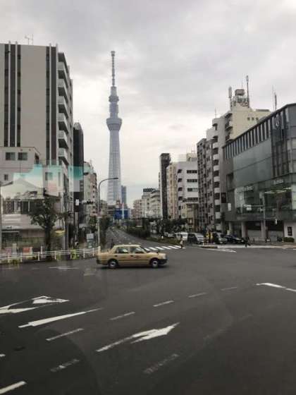 見学場所のスカイツリーに間もなく到着です。子どもたちは、車中から一生懸命写真を撮っていました。