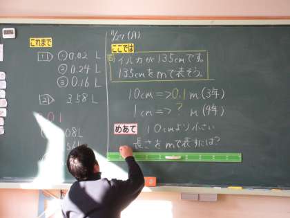 11月27日(月) 4年算数 公開日 2023/11/27 更新日 2023/11/27 できごと めあて「10cmより小さい長さをmで表すには?」を立て、問題「イルカが135cmです。135cmをmで表そう」をもとに考えました。