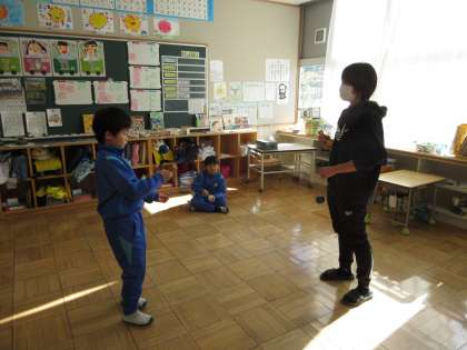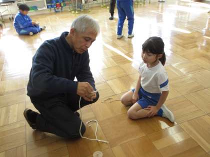「昔の遊び」で、けん玉やこま、お手玉、ヨーヨーなどにチャレンジしました。