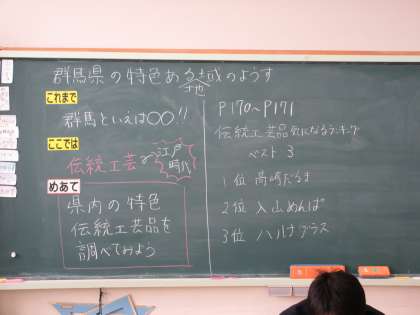 1月15日(月) 4年社会 公開日 2024/01/16 更新日 2024/01/16 できごと 「群馬県の特色ある地域の様子」で、めあて「県内の特色伝統工芸品を調べて見よう」を立て、気になる伝統工芸品を発表し合い、その伝統工芸品について調べました。