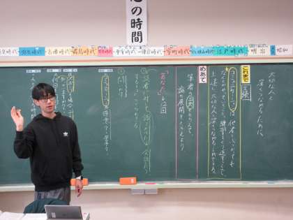 「メディアと人間社会」で、これまでに筆者の主張「コミュニケーションは、他者とぶつかっても何とかやっていくこと。練習を繰り返すことで上達し、大切な人と深くつながることができる」を捉えてきました。ここでは、めあて「筆者の工夫を見付け、論の展開を捉えよう」を立て、筆者の工夫を見付けて発表し合いました。