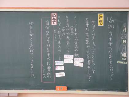 1月29日(月) 4年国語 公開日 2024/01/29 更新日 2024/01/29 できごと 「ウナギのなぞをおって」で、めあて「自分のきょうみをもった部分を中心に要約しよう」を立て、「レプトセファルスの旅(場所)」「年月がかかったこと(年月)」「レプトセファルスのこと(大きさ)」など自分が興味を持った部分を中心に要約文を書きました。