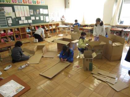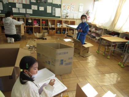 1月30日(火) 2年図工 公開日 2024/01/30 更新日 2024/01/30 できごと 「だんボールに入ってみると!?」で、めあて「だんボールに入って○○をつくろう」を立て、段ボールをつなげたり、切ったり、くっつけたりしながらつくりたい物をつくりました。