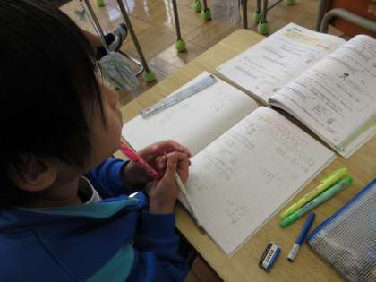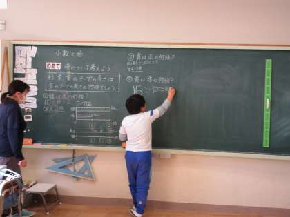 1月30日(火) 4年算数 公開日 2024/01/30 更新日 2024/01/30 できごと 「小数と倍」で、めあて「倍について考えよう」を立て、問題「緑(60cm)、青(45cm)、黄(15cm)の長さは赤(30cm)のテープの長さの何倍でしょう」から考えました。