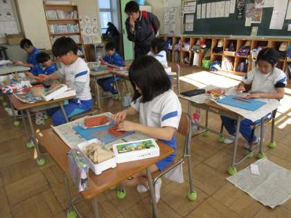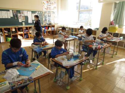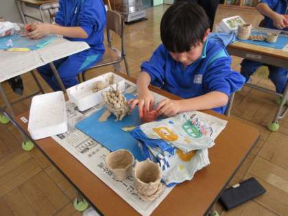 めあて「粘土の形(ひも状・板状)から表したいことを考え、立たせ方や組み合わせ方を工夫してつくる」を立て、作品作りを行いました。