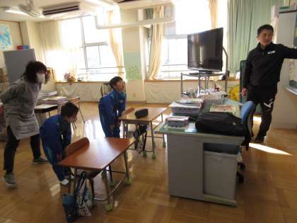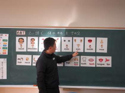 外国語活動で、めあて「えい語で 体やかおを言おう」を立て、体の部位の言い方を知り、ゲームを楽しみました。