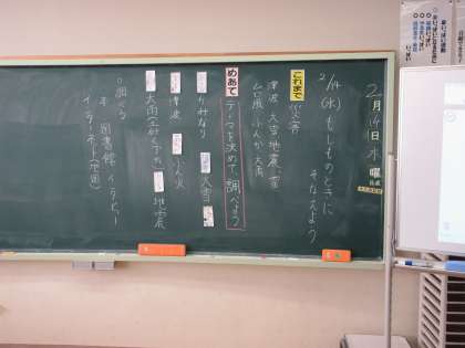 2月14日(水) 4年国語 公開日 2024/02/14 更新日 2024/02/14 できごと 「もしものときにそなえよう」で、めあて「テーマを決めて調べよう」を立て、雷や大雪、津波、噴火、土砂崩れ、地震など調べたいテーマを決めて、本やインターネットを使って調べました。