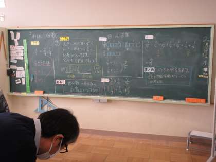 めあて「仮分数+真分数の計算はどうするのか?」を立て、図や式、言葉を使って考えました。