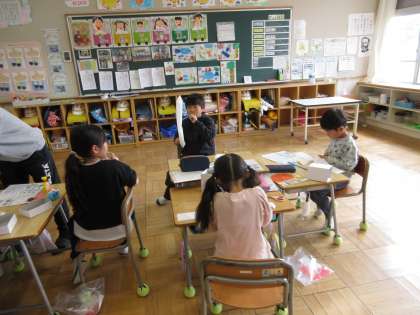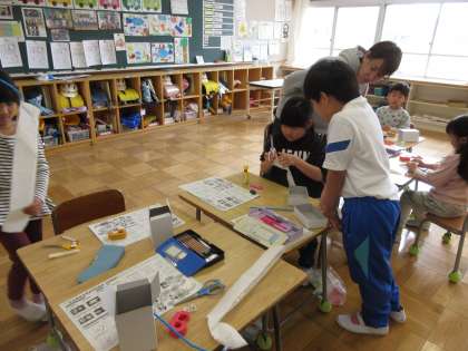 「にょきにょき とびだせ」で、めあて「はこの むきをかんがえて つくろう」を立て、ビニール袋に息を吹きかけ膨らましたり、縮めたりする作品作りに取り組みました。