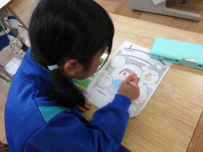 「好きなもの」「好きな食べ物」「好きな色」「好きな動物」「好きな遊び」、そして自分の顔を絵で表現しました。