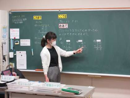 4月23日(火) 2年算数 公開日 2024/04/23 更新日 2024/04/23 できごと めあて「いろいろなたしざんの ひっさんしのかたを かんがえよう」を立て、一の位に0のある計算の仕方を考えました。