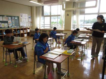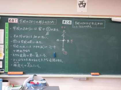 めあて「学校のまわりの様子をまとめよう」を立て、探検し、個々にまとめてきたことを発表し合い、まとめでは「学校のまわりには、家、店、畑などいろいろなものある」とまとめることができました。
