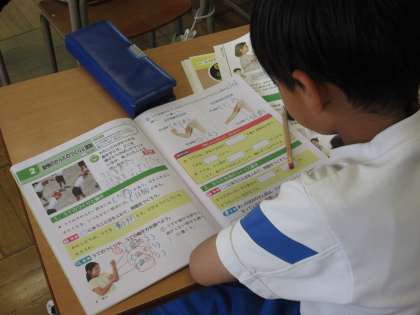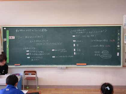 「動物のからだのつくりと運動」の学習で、めあて「ものを持ち上げたとき、うではどうなっているだろうか?」を立て、実際にものを持ち上げ動きを確かめたり、気付いたことを発表し合ったりしました。