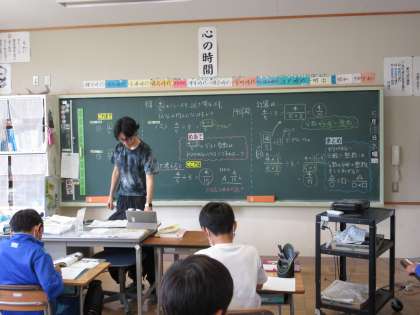 5分の4÷3の分子と整数が割りきれないときは、どうすればよい?」を立て、計算の仕方を考えました。まとめでは「割り切れない分数÷整数は分数の分母掛ける整数をしてあげる」とまとめることができました。