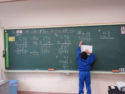 5月16日(木) 5年算数 公開日 2024/05/16 更新日 2024/05/16 できごと めあて「小数×小数の筆算をもっと早くできるこつをみつけよう」を立て、計算後にどこに小数点を打てばよいか簡単な方法を考えました。