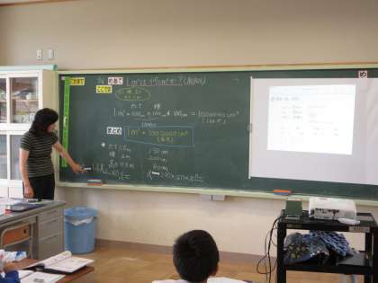 めあて「1立方メートルは何立方センチメートル?」を立て、1m=100cmをもとに考えました。