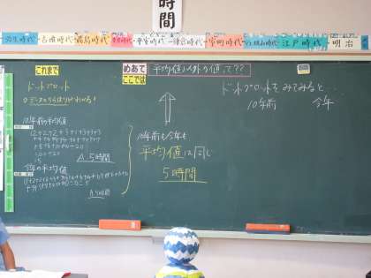 めあて「平均値以外の値って?」を立て、ドットプロットのデータを見ながら話し合いました。