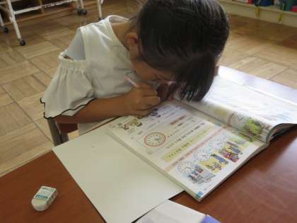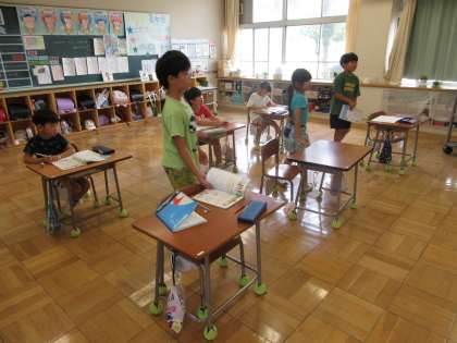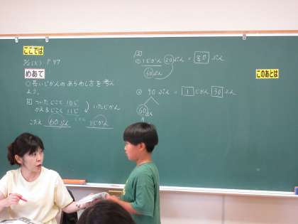 めあて「長いじかんのあらわし方を考えよう」を立て、分で表されたものを時間と分で表したり、時間と分で表したものを分だけで表したりする方法を考えました。