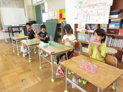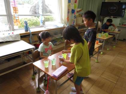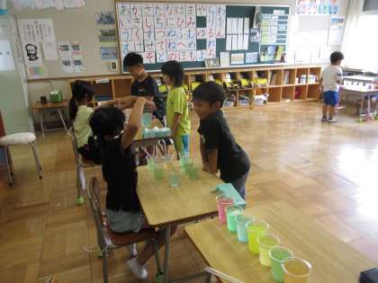 7月2日(火) 1年図工【進んで学ぶ子】 公開日 2024/07/02 更新日 2024/07/02 できごと めあて「からふるいろみずをつくろう」を立て、絵の具を用いて色水をつくり、お店屋さん(ジュース屋)ごっこをして楽しみました。