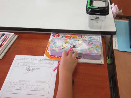 7月2日(火) 2年国語【進んで学ぶ子】 公開日 2024/07/02 更新日 2024/07/02 できごと トンボとテントウムシの観察をしました。よく見て分かった特徴などを絵と文でまとめることができました。