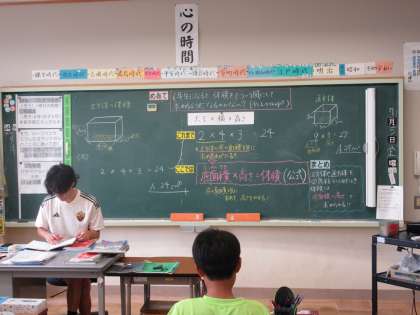 7月8日(月) 6年算数【進んで学ぶ子】 公開日 2024/07/08 更新日 2024/07/08 できごと めあて「6年生になると、体積をどういう風にして求めるのだろうか?」を立て、これまで習った公式「縦×横×高さ」を、立方体や直方体としてみたとき、体積は「底面積×高さ」で求められることを学習しました。