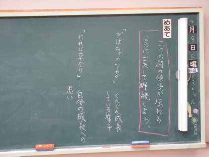 9月3日(火) 5年国語【進んで学ぶ子】 公開日 2024/09/03 更新日 2024/09/03 できごと めあて「二つの詩の様子が伝わるように工夫して群読しよう」を立て、「かぼちゃのつるが」と「われはくさなり」の詩をグループで工夫しながら音読をしました。