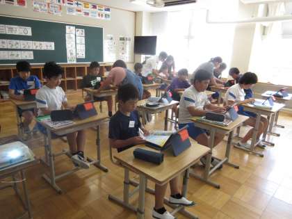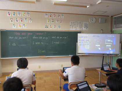 9月5日(木) 6年外国語【進んで学ぶ子】 公開日 2024/09/05 更新日 2024/09/05 できごと 夏休みにしたこと(How was your summer?)で、食べたものや行ったところ、楽しかったことを英語で発表し合いました。