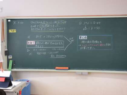 めあて「積をがい数で求める方法を考えよう」を立て、教科書の問題文をもとに考えました。