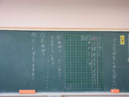 9月12日(木) 1年国語【進んで学ぶ子】 公開日 2024/09/12 更新日 2024/09/12 できごと 物語文「やくそく」の1の場面を読み取る授業でした。誰が、どこで、何をしているのか、考えました。