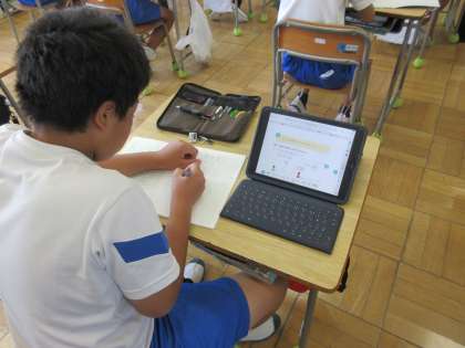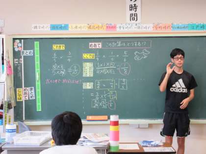 9月12日(木) 6年算数【進んで学ぶ子】 公開日 2024/09/12 更新日 2024/09/12 できごと 分数のかけ算の学習に取り組みました。計算の途中で約分することで、速く簡単正確に解けると気付くことができました。